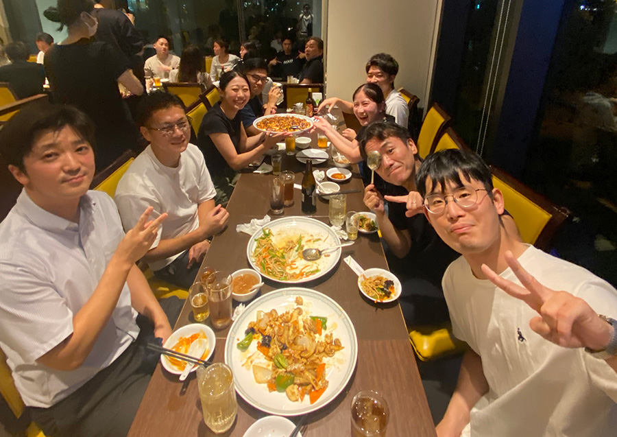 開催までの準備は、幹事の蒼矢プランナーをはじめとする社員のサポートを得て進められ、当日は35名の社員が参加し、蒼矢プランナーと同期の近藤プランナーが一緒に乾杯の音頭を取りスタート。美味しい料理を囲みながら、部署や役職を超えた会話を楽しみ、約1時間経過したところで席替えを行い、参加者がより多くの社員と話せるよう工夫しました。