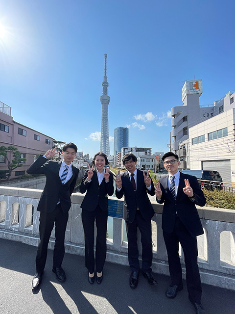 今年は全員が関東エリアに在住していますが、初めて訪れる場所も多かったようで「私もゲストに様々なことを紹介できるように勉強を頑張りたいと思いました。」と話す新入社員。そして満開の桜の木の下で全員で記念撮影。