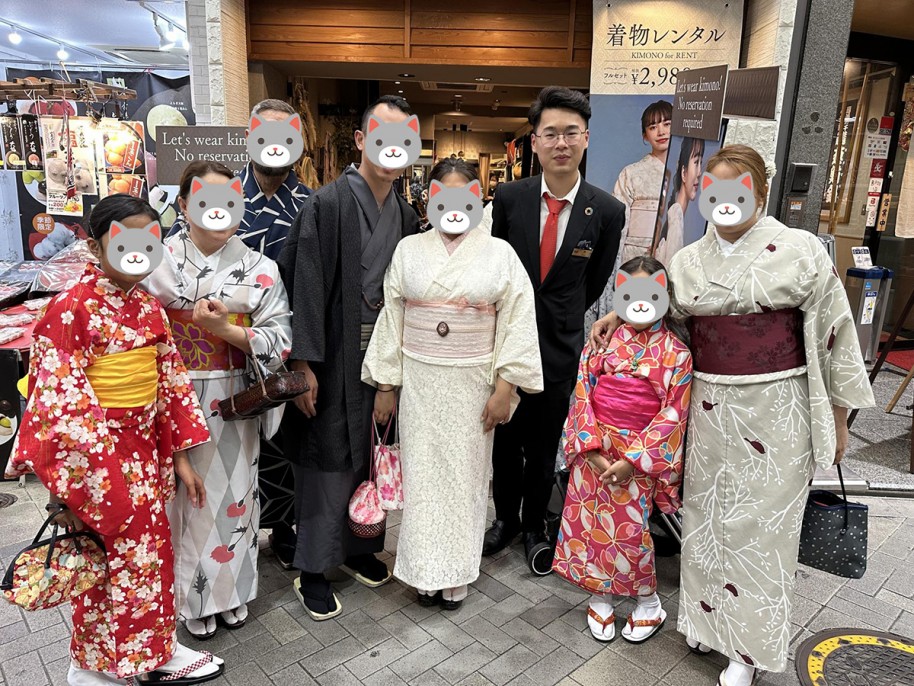 銀座、築地、秋葉原の観光を終えて次の目的の浅草に出発する際、浅草後の行程は全部行かなくていいから、浅草で着物体験したいとご要望をいただきましたので手配をお手伝い(アウテックと契約のある着物ショップを利用)。ゲストの皆様に着物体験できるとの旨をお伝えすると、すごく喜んでおりました。