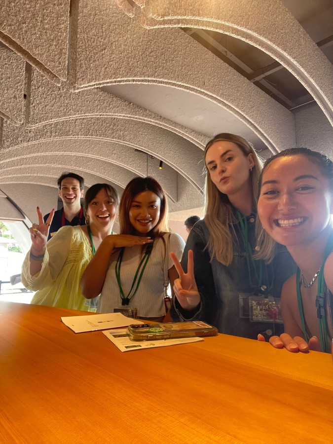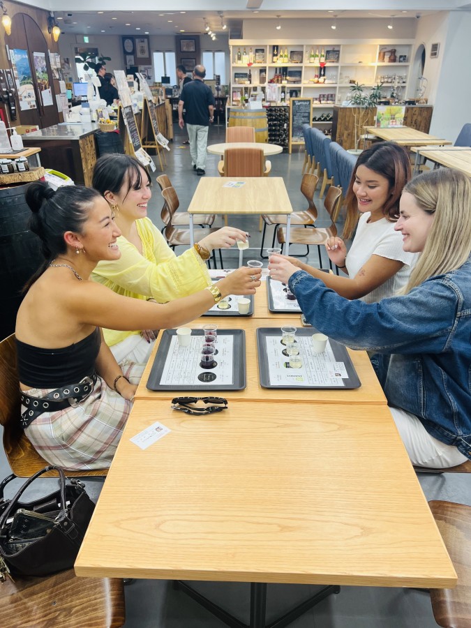 皆様はバスツアーで日本ワインの歴史について学びながらワインの試飲を楽しみました。赤ワインと白ワインの2種類を試飲し、「日本のワインは甘くてフルーティーで、アメリカやヨーロッパのワインはもっと強い」といった印象を持たれたようです。私はノンアルコールのぶどうジュースを試しました。美味しかったですが、少し甘かったです。私自身も登美の丘ワイナリーに訪れるのは初めてだったので、ワイナリーの素晴らしさに感動しました。