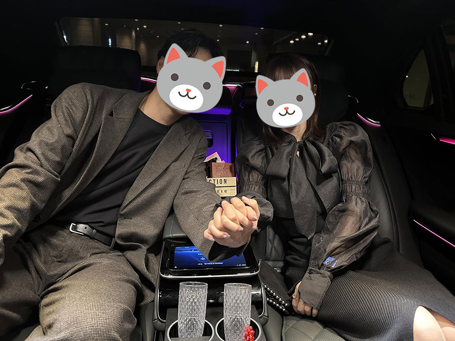 約2時間後、再びレストランにお迎えに行くと、女性ゲストは「えー、いるー!!!」と驚かれていました。ご乗車いただき、改めて自己紹介をし、シャンパンやお口直しのチョコレートをご案内しました。事前にいただいたリクエストBGMをかけながら、ロマンチックな雰囲気を演出するために車内ライトをピンクに設定しました。車内では少しお二人からの質問に答えたり、出会いの馴れ初めなどを伺ったりしながら走行いたしました。