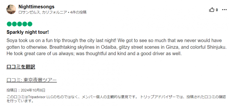 昨夜はソウヤが私たちを市内の楽しい旅行に連れて行ってくれました!他の方法では決して見ることができなかったであろう多くのものを見ることができました。お台場の息を呑むようなスカイライン、銀座の華やかな街並み、そして華やかな新宿。彼はいつも私たちをとても気遣ってくれました。思慮深く親切で、良いドライバーでもありました。