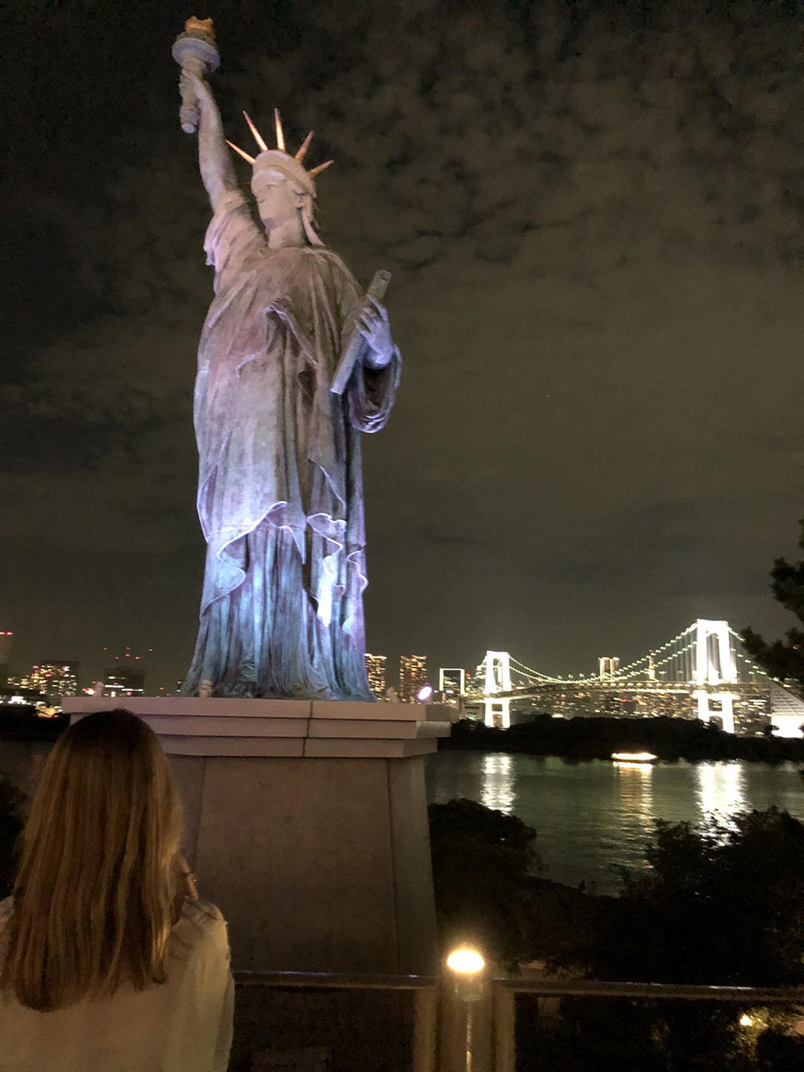 レインボーブリッジを背景に写真撮影をお手伝い。自由の女神像があることをお伝えすると日本に存在することにびっくりしておりましたので、アメリカの7分の1ぐらい小さいサイズですとお伝えしました。ゲストはアメリカの自由の女神の中には入れることができるよ。と教えてくださいました。